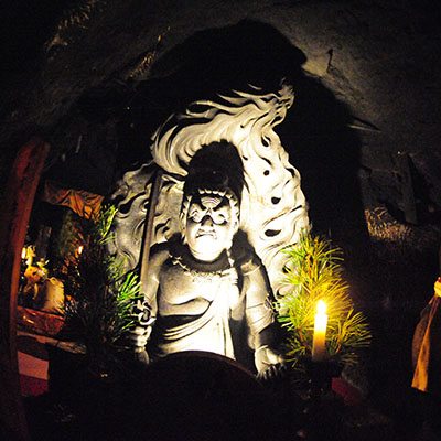 『恵門之不動』に於いて、神秘的な洞窟の奥にある護摩壇で焚かれる護摩は、恐怖すら覚えるほどの燃え盛る炎の前で僧侶たちが命がけの護摩を焚きで「五大護摩」の名称の通り、地、水、火、風、空、全ての恵みに感謝を捧げるべく、五座に分けて数千本の添え護摩木を炎に焚き上げます。